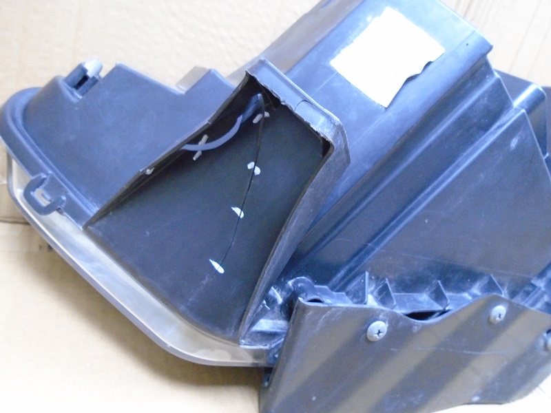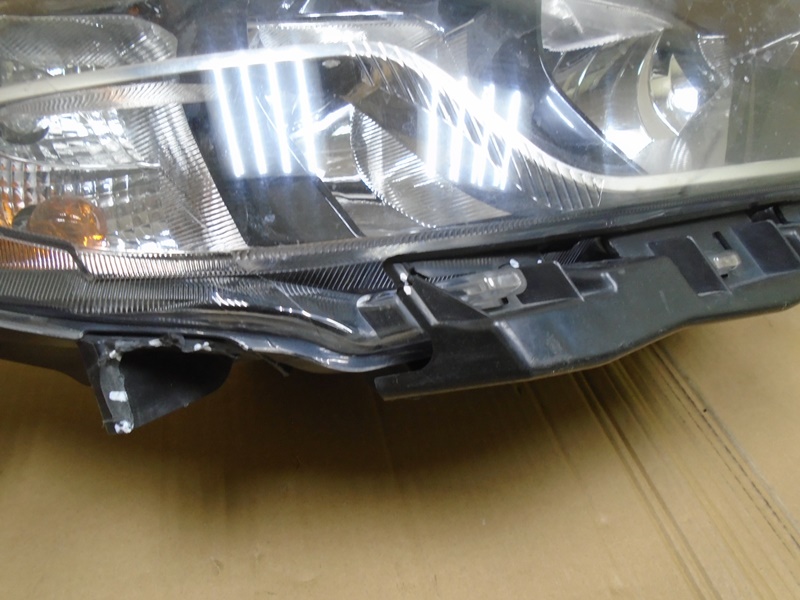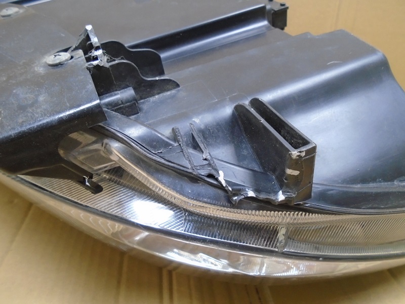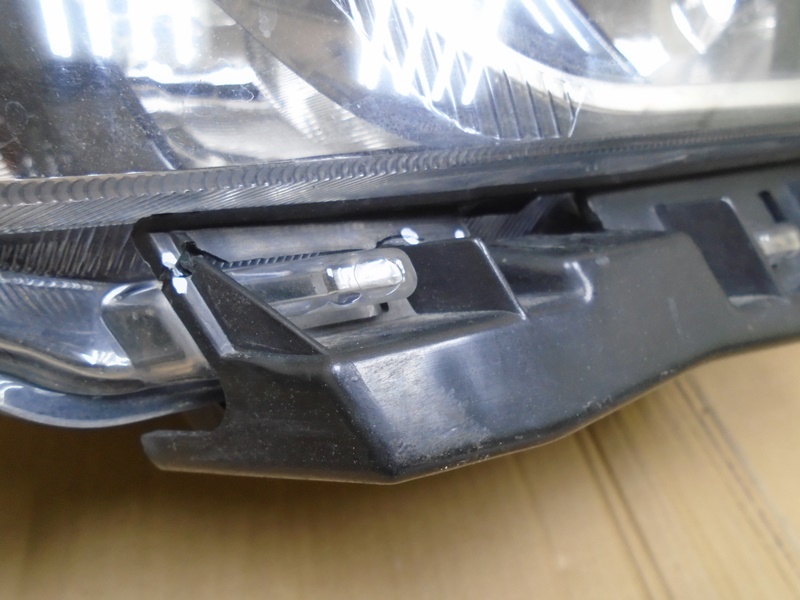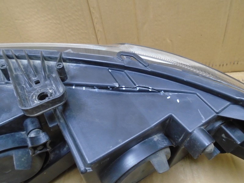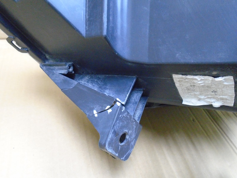 Описание: на корпусе трещина сверху, дефекты трех нижних креплений, под стеклом следы от засохшей воды, на кронштейне бампера трещина.